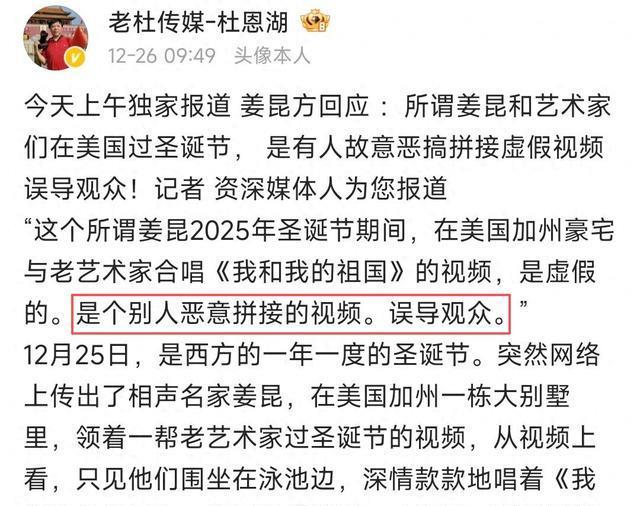 那时一段姜昆在庭院里拉手风琴、和东谈主齐唱《我和我的故国》的视频被疯传,发布者稀奇标注“加州豪宅”“圣诞狂欢”,蓦地引爆公论。