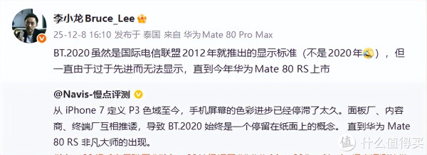 协调双层OLED + BT.2020色域这些特征,不少东说念主意想该博主说的厂商即是华为,新旗舰即是华为Mate 90系列。毕竟华为Mate 80 RS也曾最初选定双层OLED屏幕,守旧BT.2020色域。按照以往居品节律,华为Mate 90 RS很可能升级到全新一代双层OLED屏幕,表露恶果说不定会更进一竿。